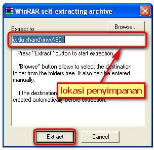 - Pada tampilan Extracting Archive, pastikan lokasi hasil extract file berada difolder yang sama dengan file install Krishand Invoicing versi 6.0.1, misalnya ada di C:\krishand\invc\601. Untuk mengubah lokasi extract file, klik tombol Browse… Jika lokasi sudah sesuai, klik Extract.