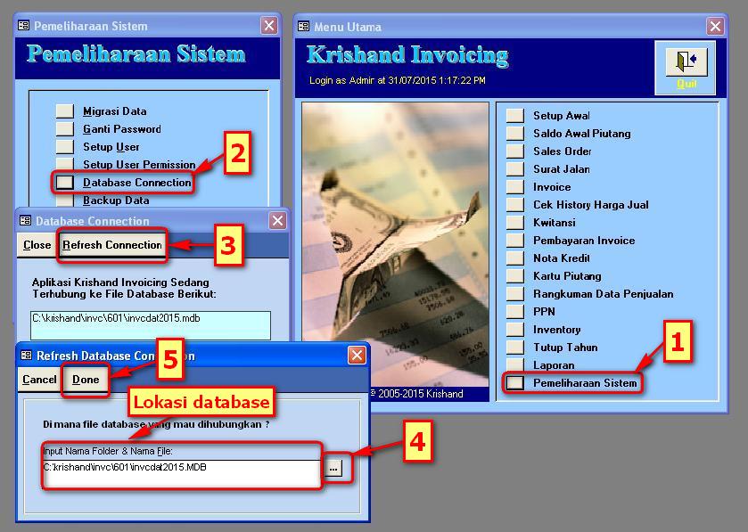 - Kemudian pada menu utama, pilih pemeliharaan sistem – koneksi database lalu arahkan ke database yang terakhir digunakan, klik refresh connection lalu […] untuk mencari file databasenya (misalnya ada di C:\krishand\invc\601\invcdat2015.mdb). Jika sudah sesuai, klik Done