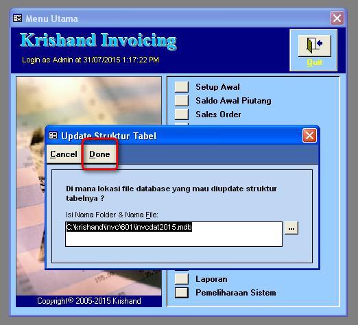 - Lalu lakukan update struktur tabel, pada tampilan menu utama tekan tombol CTRL + SHIFT + U dari keyboard secara bersamaan. Pastikan lokasi database sesuai dengan yang sudah di setting pada langkah diatas. Jika belum sesuai, klik […] dan arahkan lokasi file databasenya. lalu klik tombol Done.