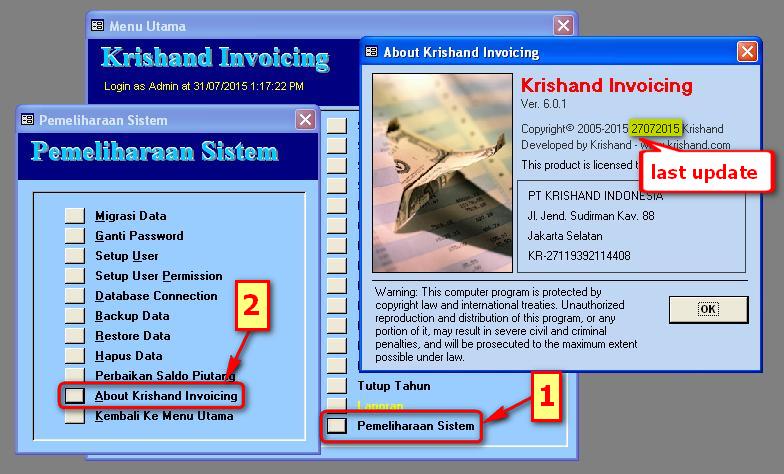 - Selanjutnya cek last update di menu Pemeliharaan sistem – About krishand Invoicing, apakah sudah sesuai dengan last update terakhir pada website ?