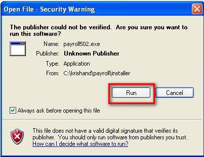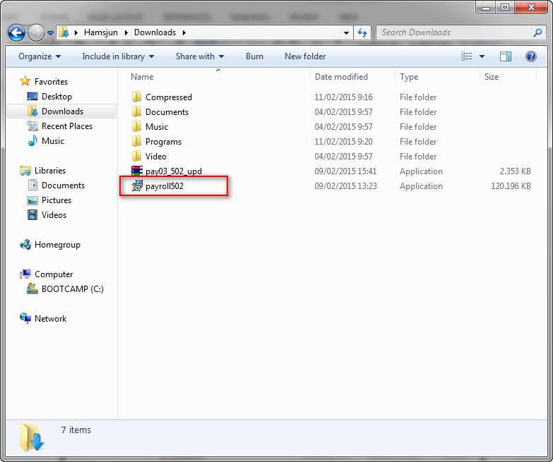 - Jika sudah selesai mendownload, buka folder yang menyimpan file tersebut, misalnya di C:\My Document\Download lalu double klik file payroll502.exe untuk memulai penginstallan.