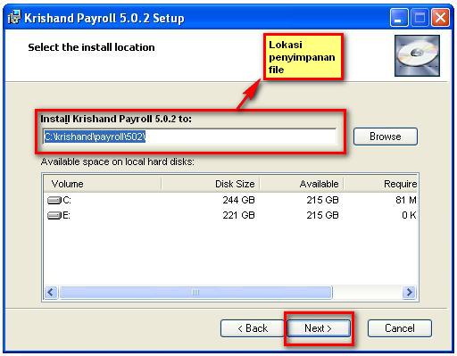 - Pada jendela Select The Install Location, otomatis akan menyimpan di C:\Krishand\Payroll\502 atau anda dapat memilih dimana anda akan menyimpan fie installer tersebut. Klik Next untuk melanjutkan proses install.