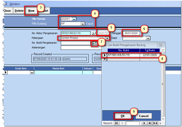 2. Pada menu retur pengeluaran klik new > pilih periode dan pilih gudang > klik tombol auto no > isi tanggal retur > pilih pekerjaan > cari bukti pengeluaran dengan klik kaca pembesar > pilih bukti pengeluaran klik Ok