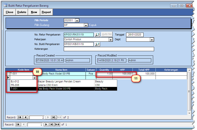 3. Setelah bagian header dilengkapi, pilih kode barang yang di retur dengan klik tombol panah bawah > isi quantity > isi nilai HPP