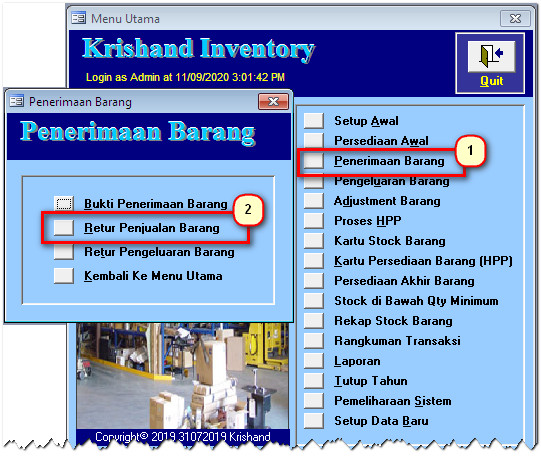1. Dari menu utama krishand pilih penerimaan barang > klik retur penjualan barang