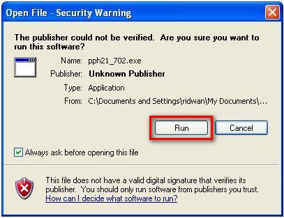 - Klik tombol Run pada jendela Open File – Security Warning.