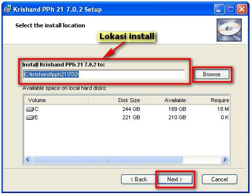 - Pada tampilan seperti dibawah ini, klik tombol Next untuk melanjutkan proses install. Installer akan membuat folder baru secara otomatis di C:\krishand\pph21\702. Untuk mengubah lokasi install file, klik tombol Browse. Jika lokasi sudah sesuai, klik Next.