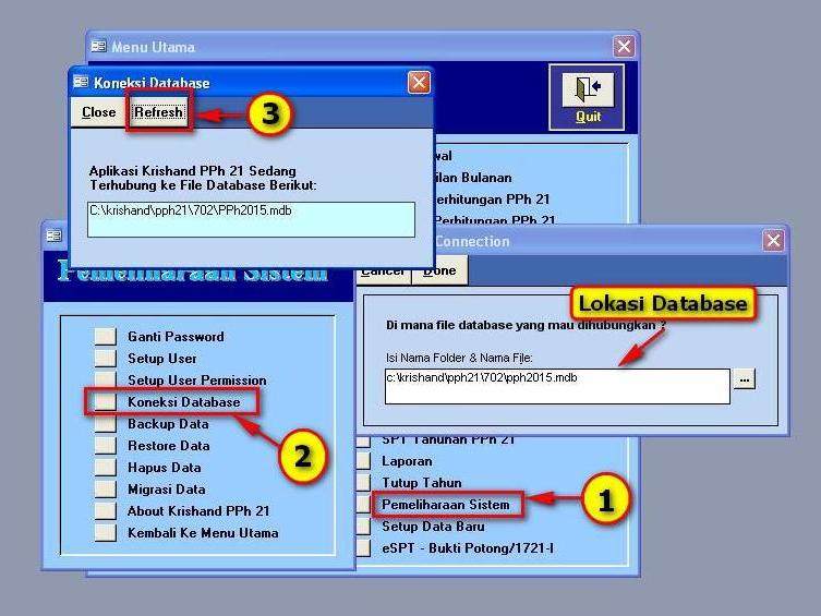 - Untuk mengkoneksikan database, pilih menu Pemeliharaan Sistem – Koneksi Database - Refresh, klik [...] untuk mencari file PPh(thn).mdb. Jika sudah sesuai, klik Done.