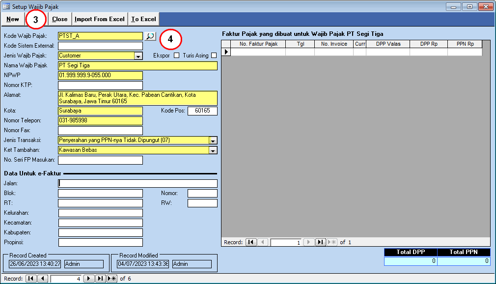 Sebelum membuat faktur pajak untuk transaksi di kawasan tertentu, buat terlebih dahulu data Wajib Pajak yang baru dengan alamat NPWP Cabang dari PT Segi Tiga pada aplikasi Krishand PPN. Berikut langkah - langkahnya :