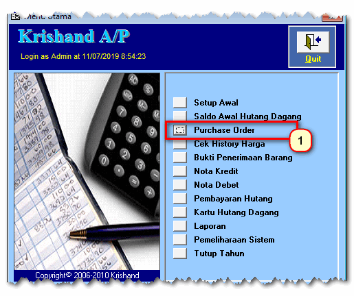 Salah satu laporan yang dapat di hasilkan oleh program krishand AP adalah PO/ Purchase Order, berikut langkah membuatnya pada krishand :
