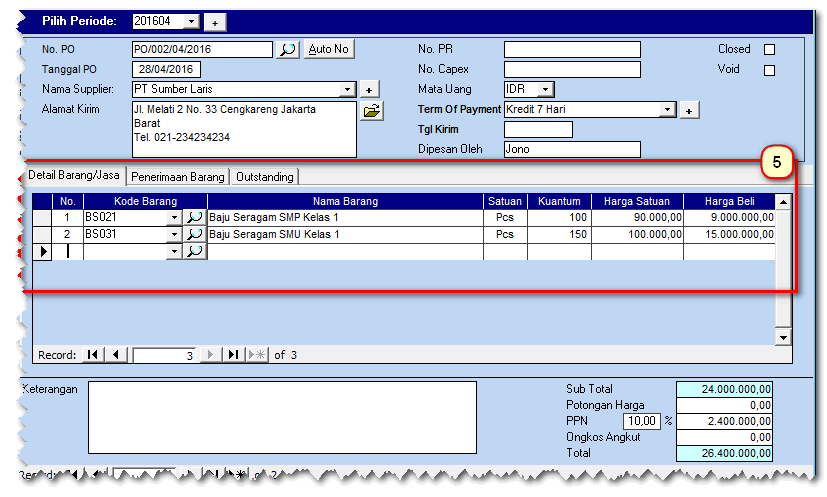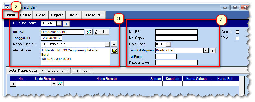 2. Pada menu purchase order pilih periode pembuatan purchase order – klik new – klik auto no – input tanggal PO