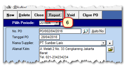 4. Setelah selesai PO di buat, untuk di cetak klik tombol report – setelah muncul menu laporan klik tombol preview