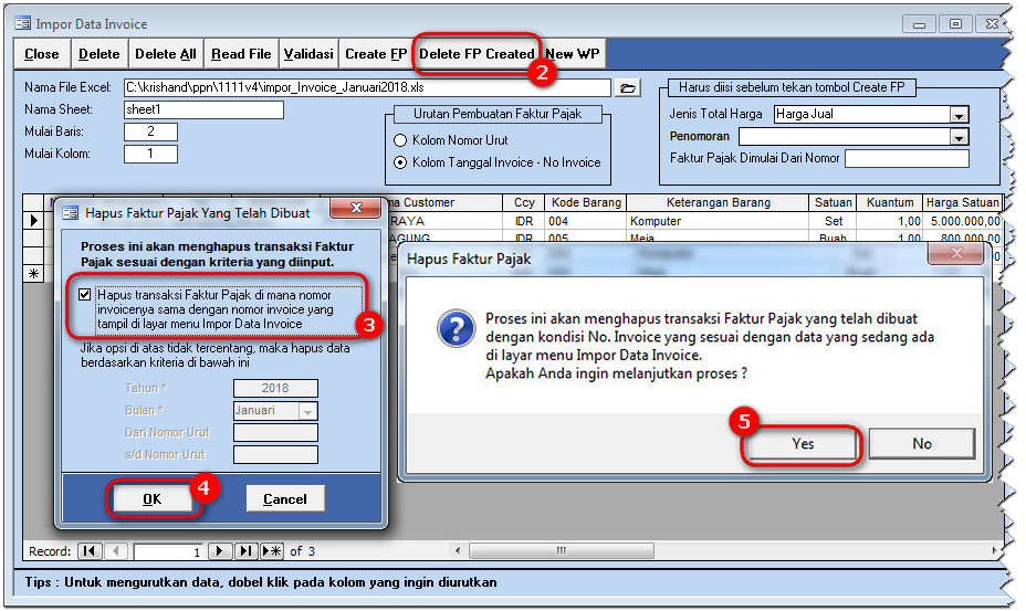 pajak di mana nomor invoicenya sama dengan nomor invoice yang tampil di layar” > klik OK > pada pesan