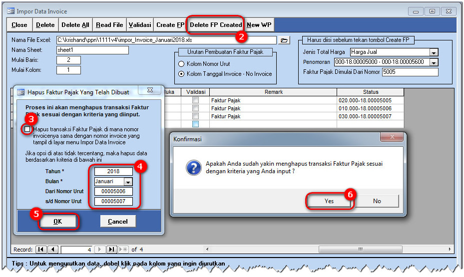 2. Klik Delete FP Created > jika data yang tampil di menu impor ingin di hapus ceklis pada kolom “hapus transaksi faktur