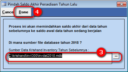 3. Pada windows arah kan database krishand tahun sebelumnya > klik tombol Done