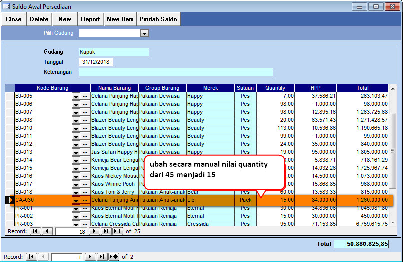 Contoh : data tahun 2018 untuk item celana anak, satuannya adalah Pcs pada tahun 2019 item tersebut berubah satuan menjadi pack (1 pack terdiri dari 3 pcs celana). setelah berhasil melakukan proses pindah saldo, maka quantity yang ada pada menu saldo awal persediaan di tahun 2019 harus di sesuaikan secara manual sesuai dengan satuan yang digunakan di tahun 2019