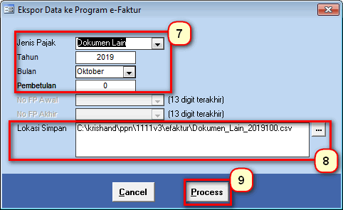 5. Pilih jenis pajak dokumen lain – isi tahun, bulan dan pembetulan SPT dari dokumen yang akan di ekspor – tentukan lokasi simpan file csv – klik tombol proses