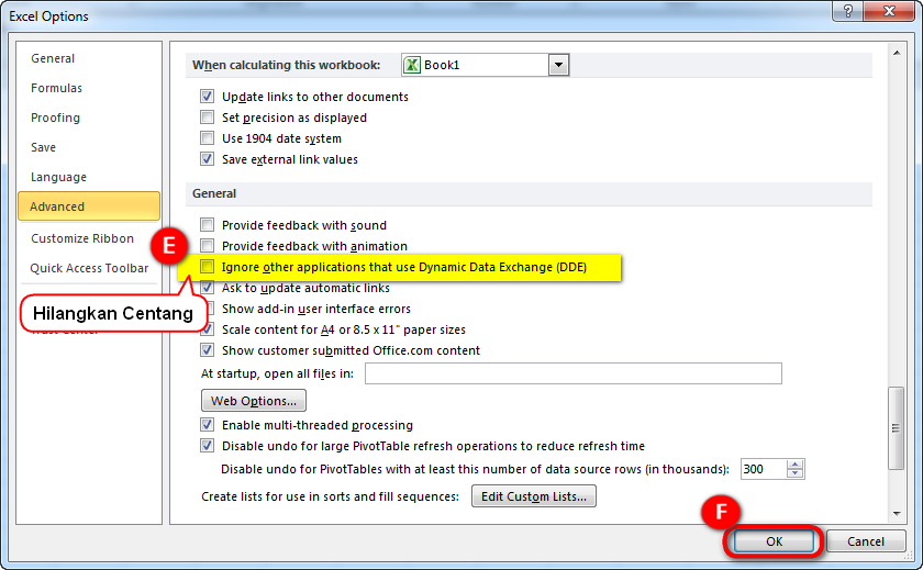 Jika "Ignore other applications that use Dynamic Data Exchange (DDE)" tercentang maka un-centang pada "Ignore other applications that use Dynamic Data Exchange (DDE)" lalu klik OK.