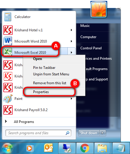 - Klik kanan pada shorcut Microsoft Excel, lalu pilih dan klik Properties.
