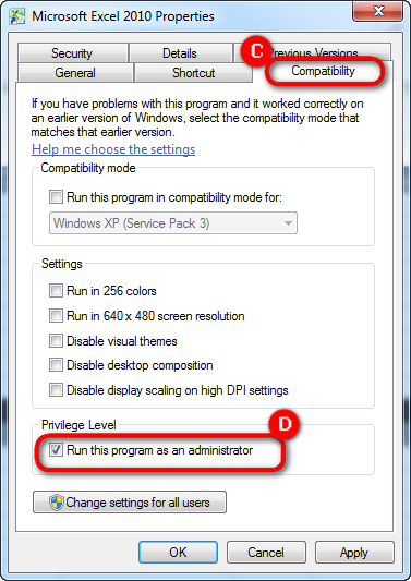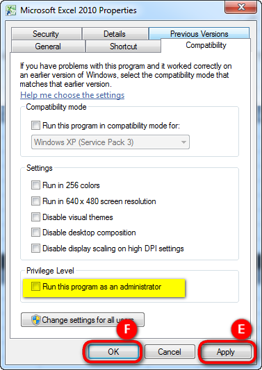 - Cek "Run this program as an administrator" yang ada di dalam compatibility pada Excel Properties dan mematikannya jika aktif