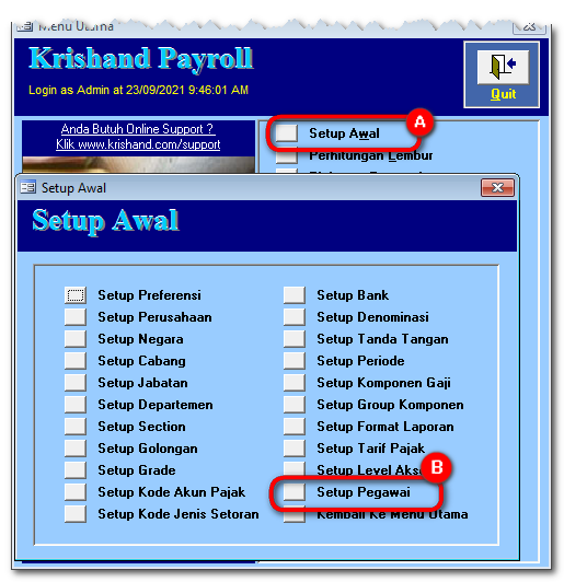 - Pada Menu Utama, pilih dan klik Setup Awal, lalu klik Setup Pegawai