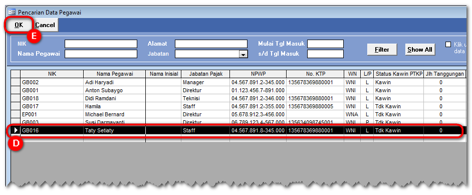 - Tunggu hingga tampil message box "Copy Data Pegawai berjalan dengan baik.", maka akan tampil pada layar data pegawai yang baru di copy.