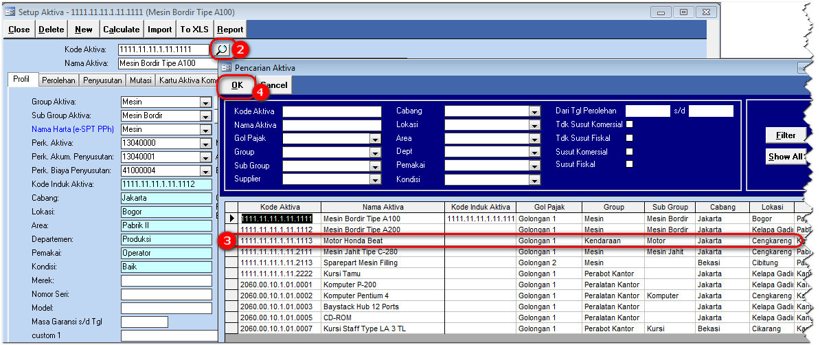 2. Klik Kaca pembesar > cari aktiva yang akan di catat perawatannya > klik OK
