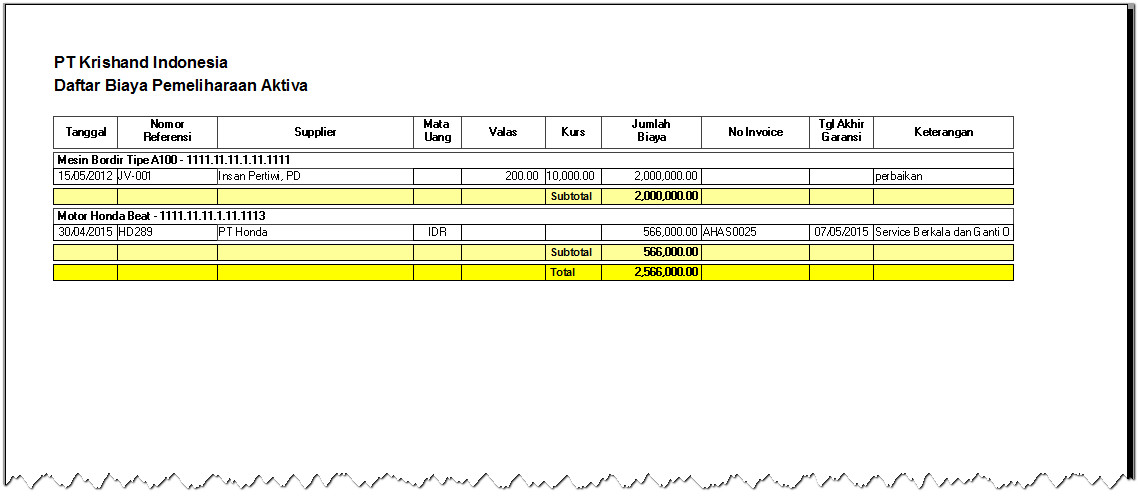 Untuk mengetahui biaya yang sudah di keluarkan untuk perawatan aktiva dapat di lihat menu laporan > pilih jenis Biaya Pemeliharaan Aktiva > isi tanggal mulai > klik preview