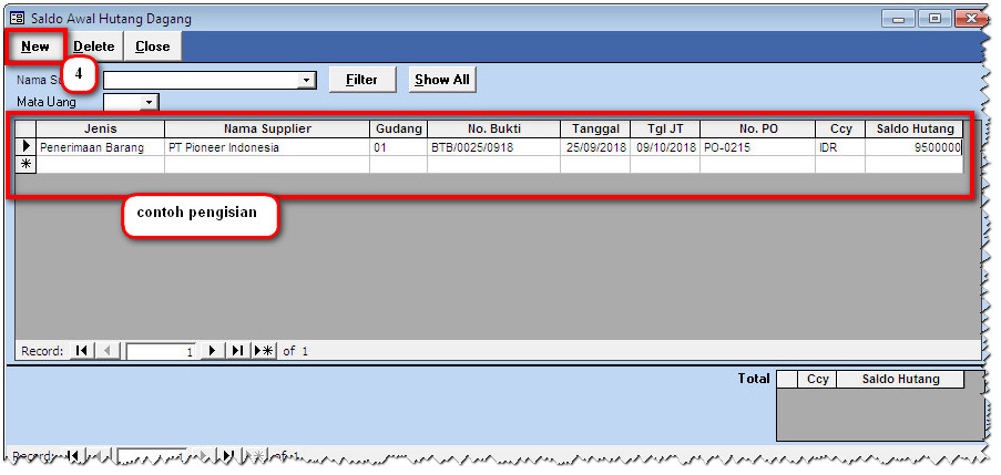 2. Pada menu saldo awal hutang dagang klik new – pada baris kosong isi