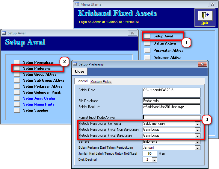 Untuk default metode penyusutan bisa di tentukan dari program fixed assets pada menu setup awal – setup preferensi – pilih metode default penyusutan