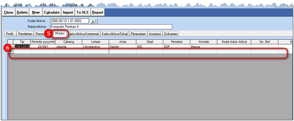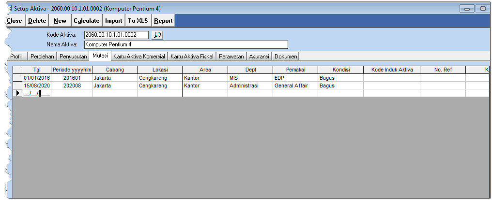 Saat ada perubahan lokasi aktiva maka pada program krishand fix asset perlu di sesuaikan pencatatan lokasinya. Pada contoh sebuah komputer yang sebelumnya ada di Dept MIS dan Pemakai EDP di pindahkan ke Dept Administrasi dan Pemakainya menjadi General Affair