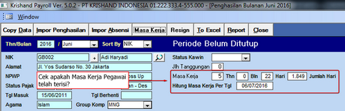 - Perhatikan Masa Kerja karyawan, apakah sudah terisi Masa Kerja Pegawai tersebut? Jika sudah, lakukan Proses Gaji.